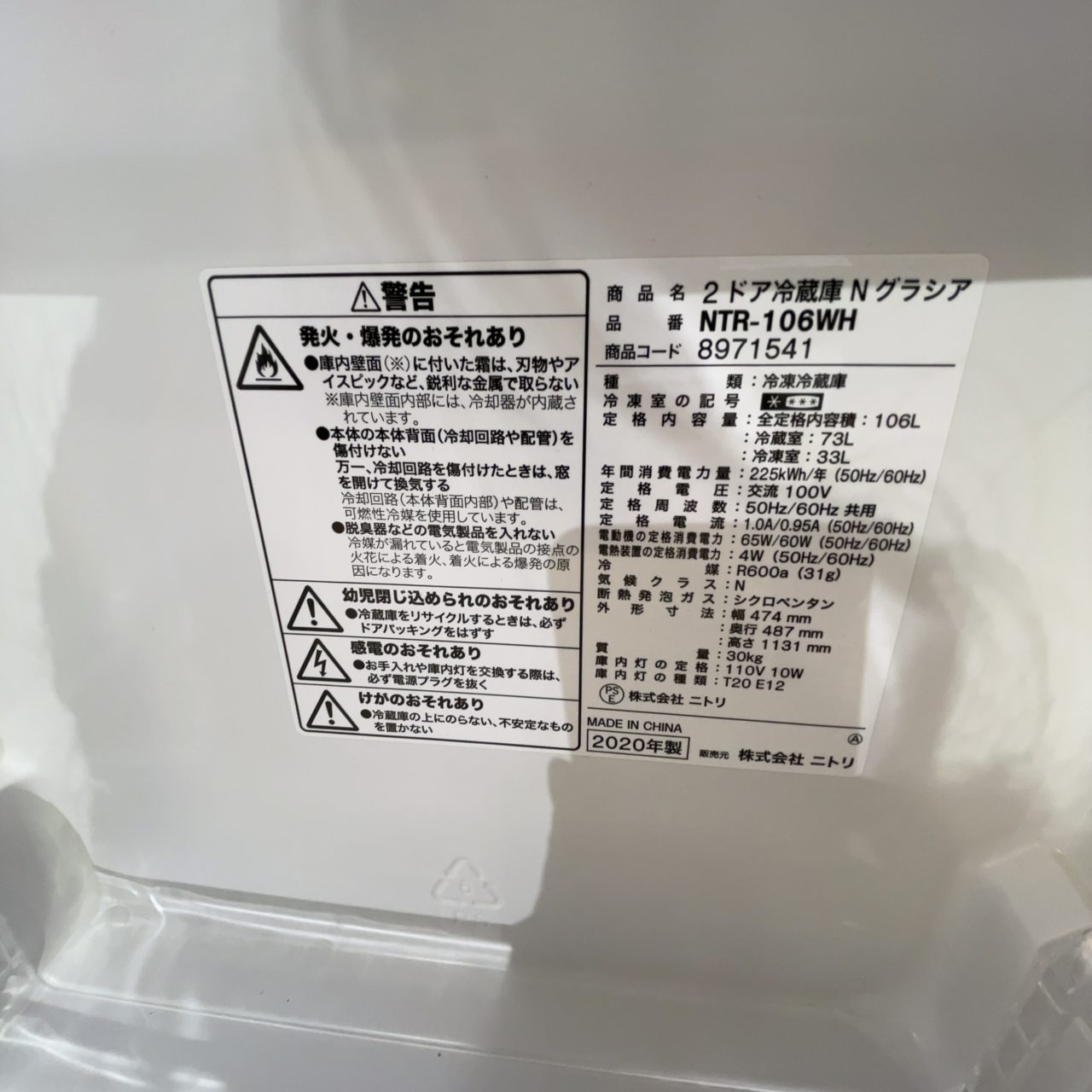 [SOLD]冷蔵庫/2020年製/106L(No:1251691)