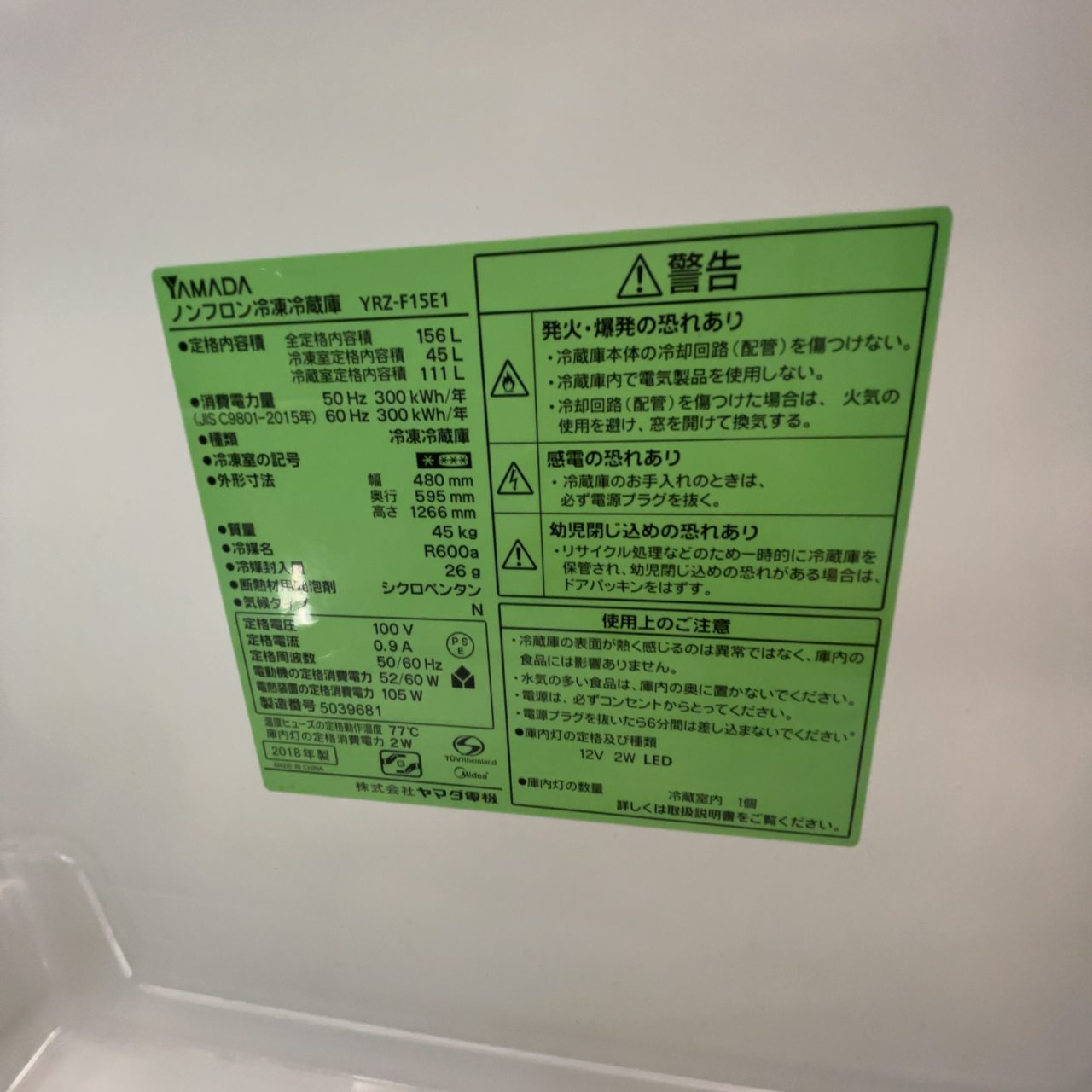 【SOLD】冷蔵庫/2018年製/156L(No:1251701)