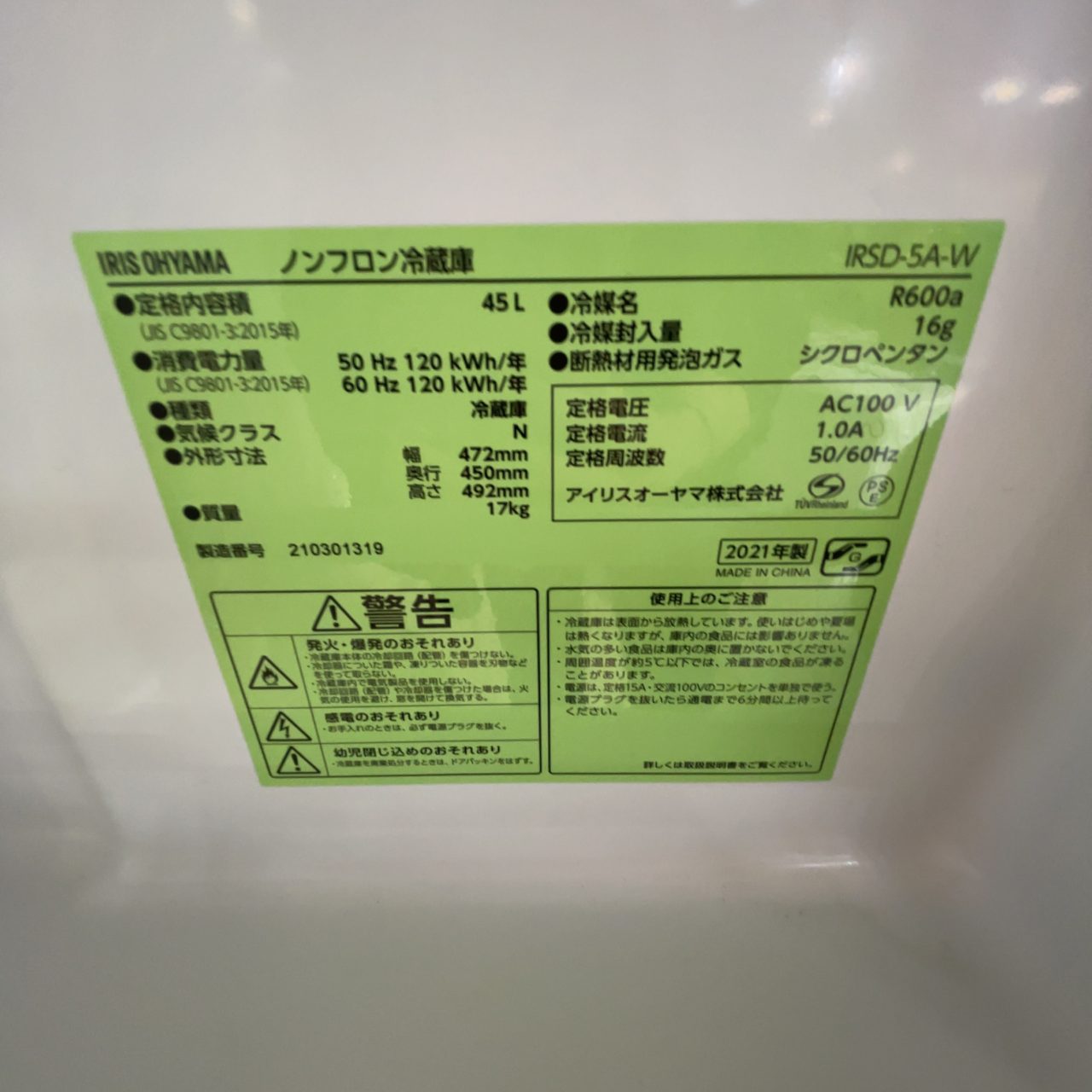 【SOLD】冷蔵庫/2021年製/45L(No:1252798)